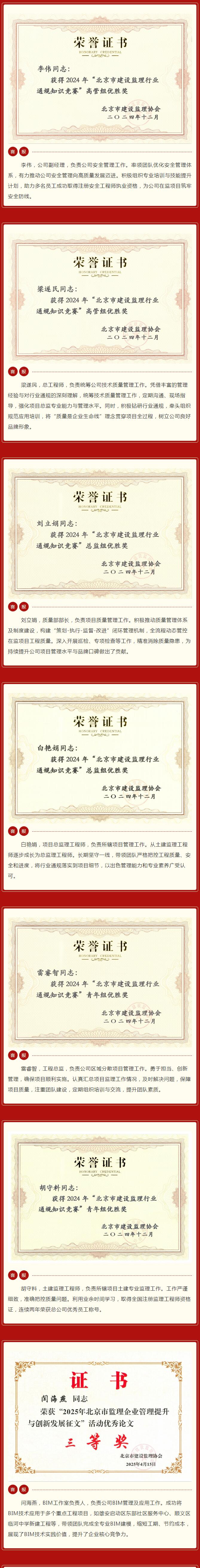 近日,由北京市住房和城鄉(xiāng)建設(shè)委員會(huì)主辦、北京市建設(shè)監(jiān)理協(xié)會(huì)承辦的“北京市2025年建設(shè)監(jiān)理工作會(huì)暨北京市建設(shè)監(jiān)理協(xié)會(huì)第七屆二次會(huì)員大會(huì)”圓滿落幕。會(huì)議對(duì)在“北京市建設(shè)監(jiān)理行業(yè)通規(guī)知識(shí)競賽”及“2025年企業(yè)管理提升與創(chuàng)新發(fā)展征文”活動(dòng)中表現(xiàn)突出的個(gè)人進(jìn)行了表彰,順金盛公司七名職工受到表彰。
