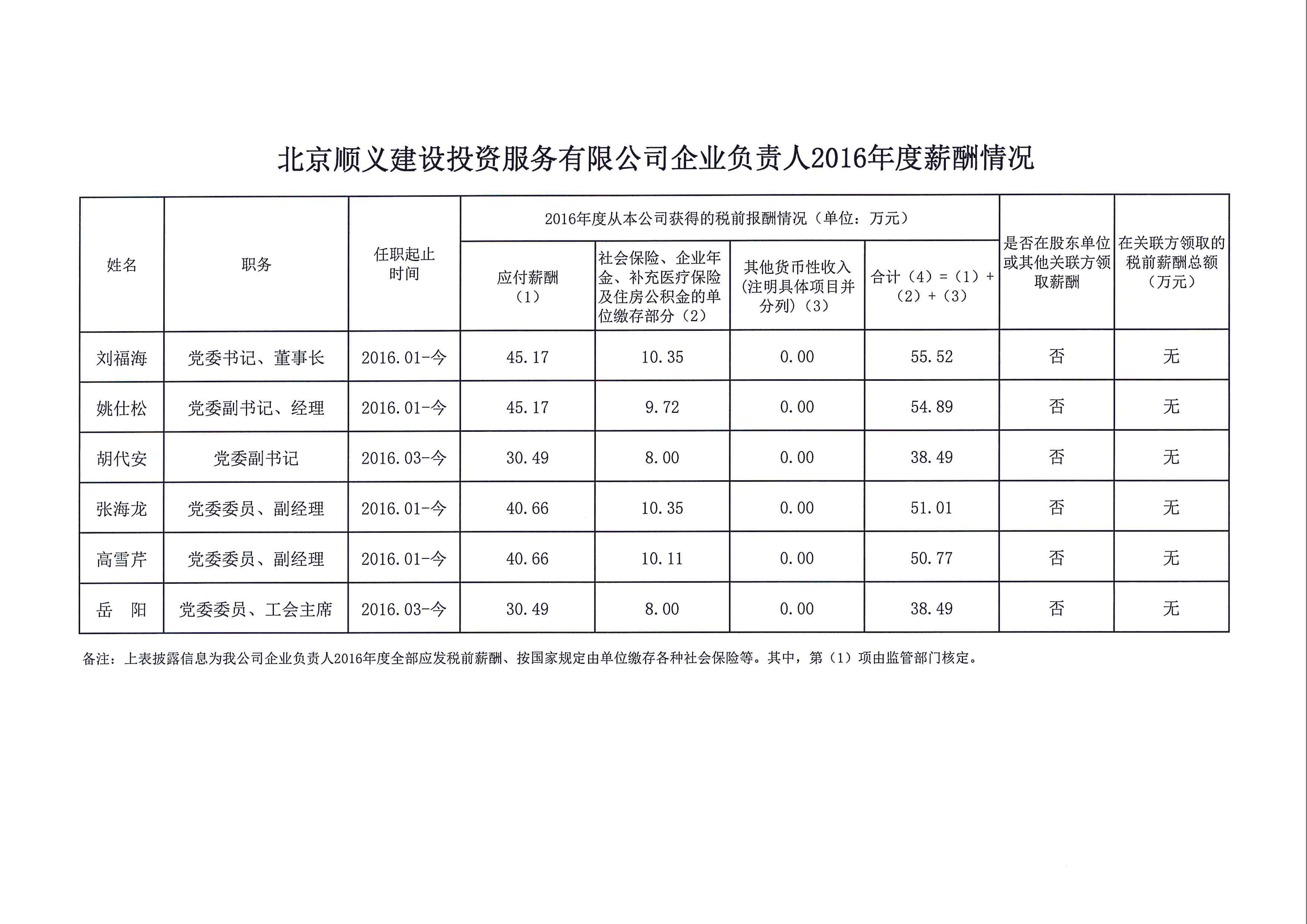 北京順義建設投資服務有限公司企業負責人2016年度薪酬信息披露