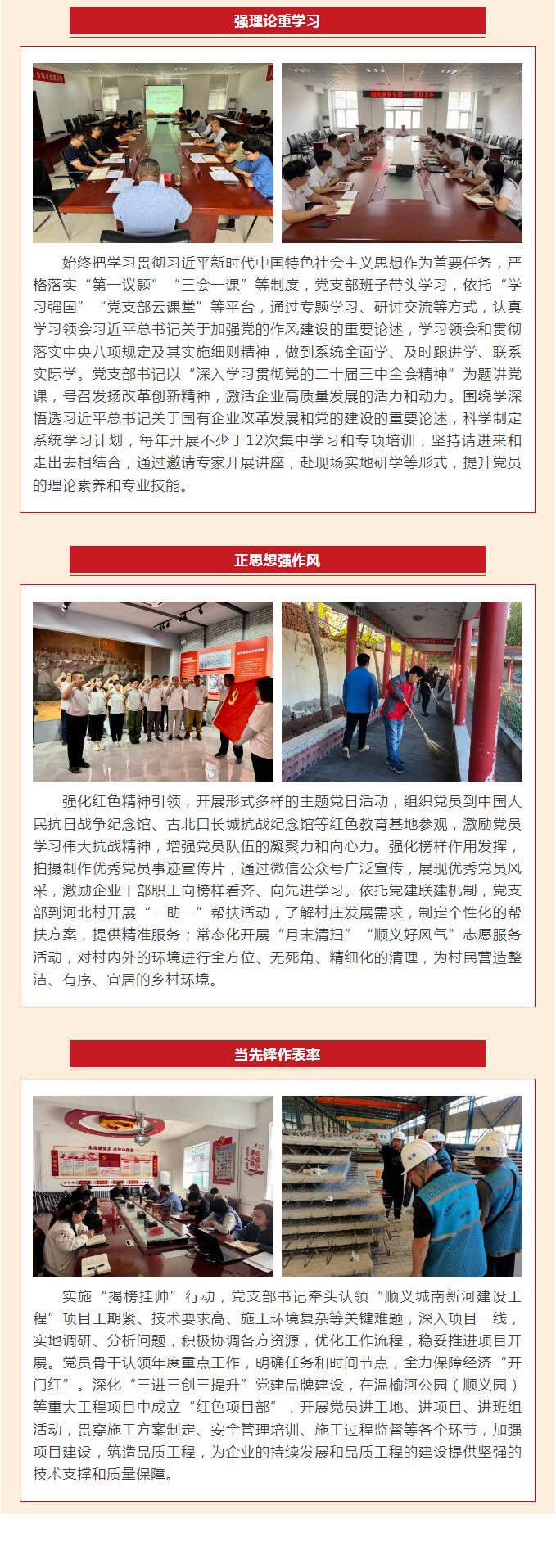 北京順政通工程監(jiān)理有限公司黨支部注重發(fā)揮戰(zhàn)斗堡壘作用和黨員先鋒模范作用,引領(lǐng)帶動(dòng)企業(yè)職工爭先創(chuàng)優(yōu)、敢爭一流,聚力賦能企業(yè)高質(zhì)量發(fā)展。