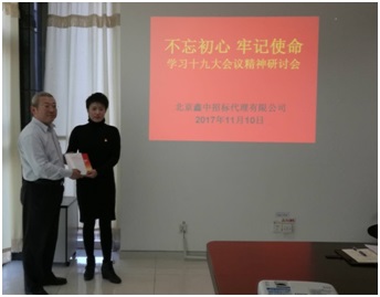 副經(jīng)理王珺向北京鑫中招標(biāo)代理有限公司黨支部贈送學(xué)習(xí)資料。