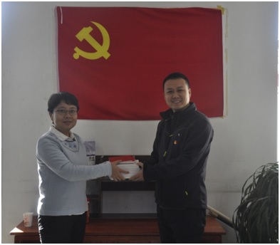 黨委委員、紀(jì)委書記毛寧向北京天儀建設(shè)工程質(zhì)量檢測所黨支部贈送學(xué)習(xí)資料。