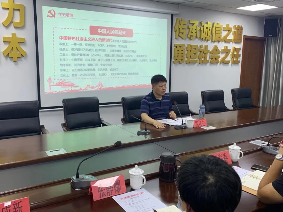 近日,黨委副書記胡代安為順金盛黨支部、陽光誠意黨支部、以及分管部門黨員講授了一堂專題黨課。胡代安同志從深刻領會黨史學習教育的重要意義、中國共產黨為什么“能”、馬克思主義為什么“行”、中國特色社會主義為什么“好”等方面講起,闡述了新中國成立以來形成的重要思想和重大意義;從“抗美援朝”、“兩彈一星”等重要歷史事件講起,講述了中國共產黨是如何一步步使中國人民站起來、富起來、強起來的;從百年來中國共產黨淬煉鍛造的紅船精神、井岡山精神、延安精神等紅色革命精神講起,論述了中國共產黨如何領導人民群眾克服各種困難挑戰,實現了中國歷史上最偉大最深刻的社會變革。