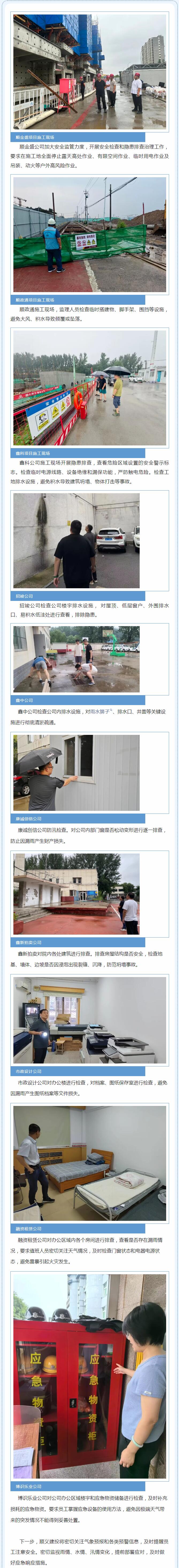 7月28日13時00分,順義區氣象臺升級發布暴雨紅色預警。順義建投立刻采取防汛應急程序,按照《防汛工作方案》《防汛指揮調度工作方案》工作要求部署開展防汛工作。公司上下聞“汛”而動,全面排查整治安全隱患。